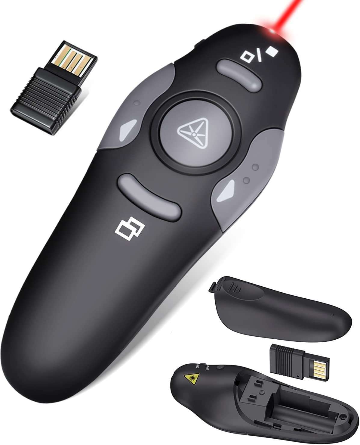 USB receiver with plug-and-play setup.Red laser pointer for enhanced visibility.
